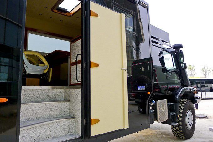 六驅越野房車底盤配置:Zetros6×6采用了14.00 R20的鋼制越野輪胎,如果用戶認為這款輪胎尺寸太大,那么奔馳還提供小尺寸的10.00 R20輪胎選裝。對于要求個性化的用戶,奔馳還為Zetros的輪胎準備了拋光的輪轂罩。Zetros雖然沒有采用烏尼莫克的招牌門式橋結構,但其前后的拋物線鋼板彈簧依然能夠保證越野時的車身承重與舒適性。這款車前后車橋都是輪邊減速橋,后橋速比為4.833。此外其前橋軸間承載極限是9噸,后橋則為18噸,整車最大總重為27噸,匹配全時6驅和輪胎充放氣系統(tǒng)成就了它重載越野之王的稱號。一副正統(tǒng)卡車駕駛席的模樣,殊不知后排有著超豪華的裝潢。德國沃爾特工廠的精細裝配工藝在這輛卡車上仍然可以體現(xiàn)出來,主副駕駛席氣墊座椅、可加熱電動外后視鏡也都是標配。Zetros的心臟目前只有一臺7.2升的奔馳OM 926LA直列6缸渦輪增壓柴油發(fā)動機,采用的SCR技術可以讓其達到歐5排放標準,最大馬力為326馬力,最大扭矩則為1300牛米。變速箱采用的是奔馳公司的G 131型9擋手動變速箱,對于特殊需求的用戶,Zetros也可以選裝自動變速箱。在控制面板上你可以很輕松的找到相應功能的控制按鈕,圖中中間部分最右側的是一個上坡攀爬系統(tǒng)旋鈕,其功效與低扭放大作用一樣,之后向左的第二個旋鈕可控制三軸之間差速鎖的開合,其形式與奔馳G63AMG 6×6的控制原理一致,三個擋位控制五把鎖 。
