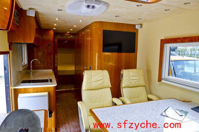 六驅越野房車車身內(nèi)整體豪華配置:在駕駛室中還有主流卡車中配備的天窗通風系統(tǒng)和后排折疊床板,這款越野房車的后排內(nèi)部具有地板加熱系統(tǒng),獨立的會客廳,高級絨布真皮座椅具備多項可調(diào)功能,雖然包裹感不是很強,但卻有一定的支撐性,更加符合越野房車的特質(zhì)。此外,中央空調(diào)、天窗與側窗外加頂部迎賓燈的點綴是恰到好處,前后對著的兩臺大尺寸液晶電視方面中央四位乘客觀看。在門口的兩側,分別是吧臺和迷你廚房,電磁爐、微波爐、冰箱應有盡有。車門頂部設有整車電路控制面板,可通過開關控制燈光、車門等等。干濕分離的衛(wèi)生間分別分布在客廳旁與臥室中,其中一間設有浴盆和真空馬桶,另一間則配有恒溫淋浴,走廊的盡頭就是這間臥室,其擁有電控臥室門,獨立中央空調(diào)、屋內(nèi)整體照明系統(tǒng)與液晶電視,此外整間臥室采用了實木裝潢,超寬的雙人床鋪足夠車主享用。