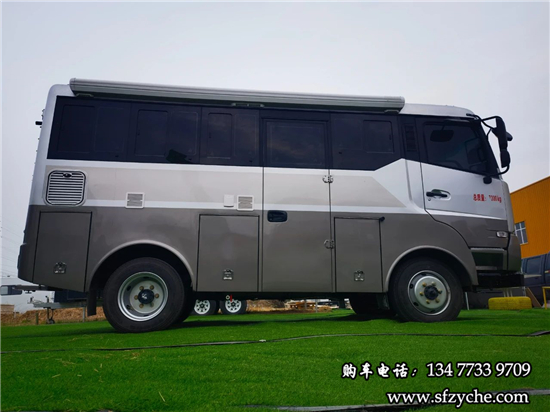 車身右側配備了4m的電動遮陽棚、市電接口、尾部工具箱、戶外照明燈,中置上客門,副駕駛乘客門,車輛門鎖均采用越野專用倉門鎖。