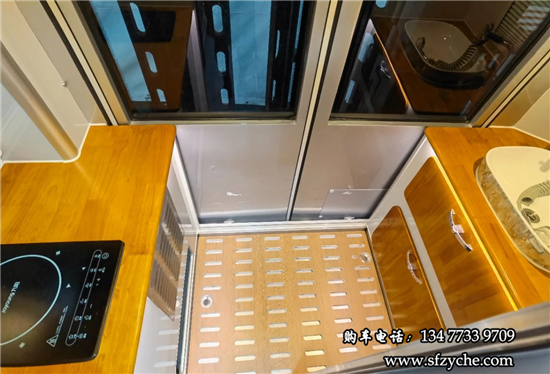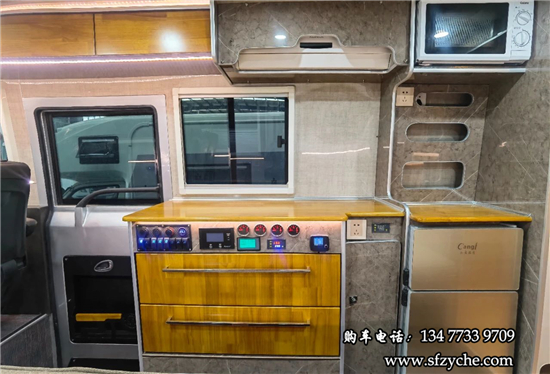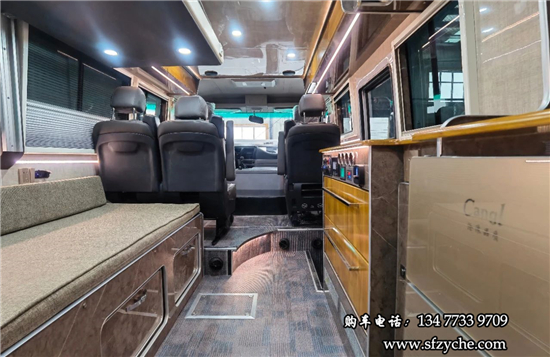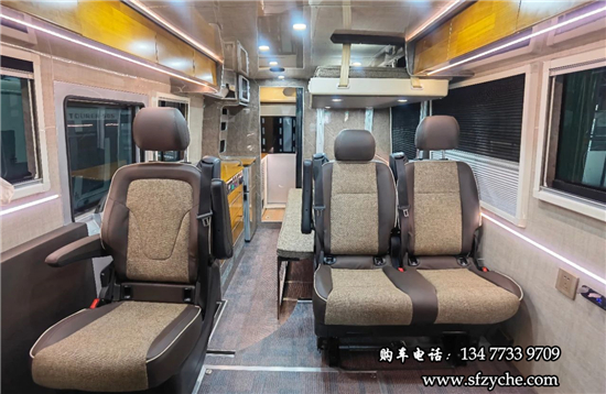 得益于方正的車身,車內空間非常寬敞,內寬可達2米。布局方面從前往后依次是駕駛區(qū)、乘坐區(qū)、生活區(qū)和尾部的廚衛(wèi)區(qū)域。整車核載5人,車廂中部采用2+1座椅布局,全部帶有扶手和頭枕,乘客座椅全部朝前設計,增加了乘坐的舒適度。
