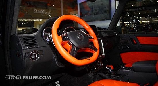 北京車展上的基于G63 AMG 6×6改裝而來的BRABUS 版700G 6 X 6 內(nèi)飾方面,該車采用了黑色和橘黃色的顏色搭配,強烈的顏色反差構(gòu)造出不錯的視覺效果。四幅式真皮方向盤外圈也采用橘黃色真皮包裹,搭配顏色裝飾條,視覺效果極佳。擋把的設(shè)計類似于飛機操作感,上面印有巴博斯的標(biāo)志,非常具有設(shè)計感。