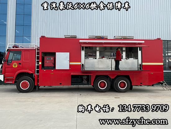 重汽豪沃6×6消防飲食保障車是根據(jù)公安,武警,消防,林業(yè)局,地質(zhì)勘探,水利水電,公路搶險(xiǎn)等部門野外執(zhí)行任務(wù)的需要,為提高后勤保障能力,改善野外生存條件而研制的一種新型野外自行式炊事車,特別適應(yīng)快速反應(yīng)部隊(duì)執(zhí)行任務(wù)的需要。該車采用重汽豪沃六驅(qū)底盤,車廂為隔熱保溫大板粘接式輕型結(jié)構(gòu),多種供電方式為車內(nèi)各用電設(shè)備提供電源。車內(nèi)配有高效的封閉式燃油節(jié)能爐灶、配套設(shè)備、各種廚具等。本車具有操作方便、使用可靠、熱效率高,保溫效果好等特點(diǎn),適應(yīng)全天候展收作業(yè),是先進(jìn)的后勤裝備?稍谝恍r(shí)內(nèi)供應(yīng)150人的主副食及開水。備注:據(jù)用戶需求,整車對(duì)底盤進(jìn)行改裝,設(shè)有8-13Kw駐車自發(fā)電系統(tǒng),1.5Kw行車發(fā)電系統(tǒng),以及配電系統(tǒng),主副食控制系統(tǒng),作業(yè)監(jiān)控系統(tǒng),水路系統(tǒng),油路系統(tǒng), 附件及工具。