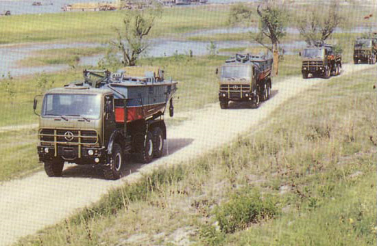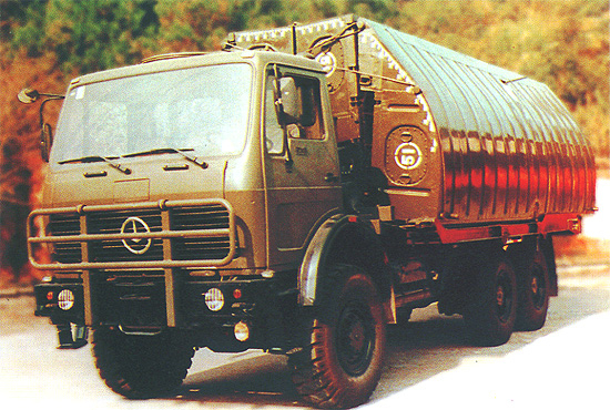 鐵馬XC2200重載卡車在1980年后期進(jìn)入PLA服役,主要用于運輸重型工程設(shè)備和武器系統(tǒng)。中國鐵馬(Tiema) XC2200重載卡車由西南汽車廠(現(xiàn)在北方- 奔馳卡車公司分部)制造,位于重慶(Chongqing)市?ㄜ囈缘聡焚惖滤-奔馳2060型卡車為基礎(chǔ)。目前卡車在PLA服役中,被當(dāng)做重型工程設(shè)備卡車和武器系統(tǒng)車底盤。PLA在1970年后期訂購了少量的德國梅賽德斯-奔馳2026型重載卡車(8噸的容量,6X6)補充它不足的重載卡車。這些卡車主要地用于重型火炮拖車任務(wù)。PLA對車輛的性能印象深刻,并且接洽梅賽德斯- 奔馳公司去得到許可在中國聯(lián)合生產(chǎn)卡車。鐵馬XC2200(最初即是TM-SC2030)的發(fā)展,梅賽德斯- 奔馳2060型的一個中國仿造型,從1980年早期開始。 西南汽車廠,一個中國北方工業(yè)總公司(NORINCO)位于重慶(Chongqing)市的下屬公司,被選擇當(dāng)做主承包商。1982年看到了原型的介紹。稍后在1985年中國從西德引進(jìn)了ZF機械變速箱和KHD413風(fēng)冷柴油發(fā)動機技術(shù),兩者在鐵馬XC2200卡車上被采用。XC2200批量生產(chǎn)在1986年開始,每年從生產(chǎn)線上生產(chǎn)2,000輛。大多數(shù)的這些車輛被PLA接收用于重貨物/設(shè)備運輸、火炮拖車和武器系統(tǒng)車底盤。車輛包括在西藏高地、戈壁沙漠和中國最惡劣的道路和天氣狀況區(qū)域展示了優(yōu)良性能和可靠性。除了被PLA部署,車輛也被輸出到巴基斯坦、泰國、印尼和斯里蘭卡。XC2200采用雙車門正向控制駕駛室,位于發(fā)動機艙上面。駕駛室有四個座位和在頂板有一個天窗。后面的貨物車身的后擋板和側(cè)擋板可放下,可拆卸蓬架和帆布蓬。單預(yù)備輪被垂直地安裝在乘員室后面,靠近載貨車箱在駕駛室和后貨物車體之間。這一個空間能用來容納一個修理工具箱和其它的裝載/卸貨設(shè)備。與第一代中國自行生產(chǎn)的重型臺車相比較,XC2200有好很多的通用性能,連同85公里/小時的最大道路速度和一個8噸的越野裝載能力。ZF5S-110/111 GPA變速箱有九個前進(jìn)檔和一個倒車檔。三個車軸和六個車輪全部運行使用速度差速器鎖定裝置,即使當(dāng)車輛的一側(cè)上一個或更多的車輪沒有與地面接觸中,或已經(jīng)失去牽引,確保車輛持續(xù)驅(qū)動。除了基本的貨物卡車改型之外,XC2200也可得到許多其它的改型, 包括4X4、8X8、長軸距貨車、起重機、掩護(hù)所、架橋車、運船車、道路鋪設(shè)車和多種武器系統(tǒng)車底盤。中國也已經(jīng)發(fā)展基于XC2200設(shè)計的WZ551輪式裝甲人員輸送車(APC)。鐵馬XC2200浮橋架橋卡車。鐵馬XC2200用于WS-1多管火箭發(fā)射裝置車底盤。鐵馬XC2200用于運船車。