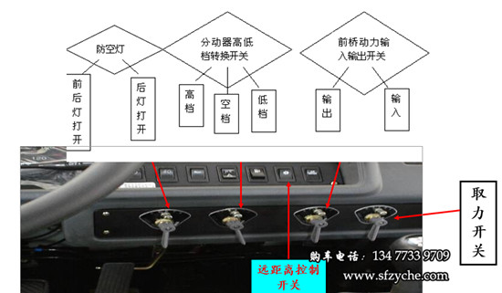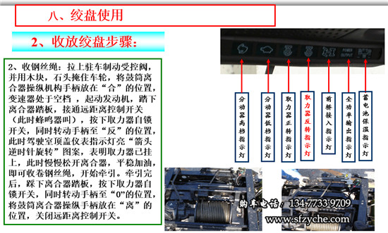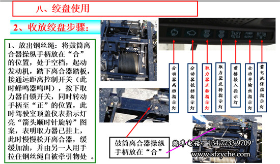 2、收鋼絲繩:拉上駐車制動(dòng)受控閥,并用木塊,石頭掩住車輪,將鼓筒離合器操縱機(jī)構(gòu)手柄放在“合”的位置,變速器處于空檔 ,起動(dòng)發(fā)動(dòng)機(jī),踏下離合器踏板,接通遠(yuǎn)距離控制開(kāi)關(guān)(此時(shí)蜂鳴器叫),按下取力器自鎖開(kāi)關(guān),同時(shí)轉(zhuǎn)動(dòng)手柄至“反”的位置,此時(shí)駕駛室頂蓋儀表指示燈亮“箭頭逆時(shí)針旋轉(zhuǎn)”圖案,表明取力器已掛上,此時(shí)慢慢松開(kāi)離合器,平穩(wěn)加油,即可收卷鋼絲繩,開(kāi)始牽引。牽引完后,踩下離合器踏板,按下取力器自鎖開(kāi)關(guān),同時(shí)轉(zhuǎn)動(dòng)手柄至“0”的位置,將鼓筒離合器操縱手柄放在“離”的位置,關(guān)閉遠(yuǎn)距離控制開(kāi)關(guān)。