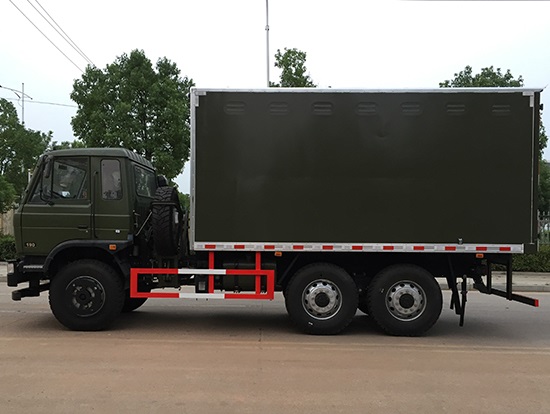 東風(fēng)六驅(qū)國(guó)五越野廂式車簡(jiǎn)介:采用東風(fēng)原廠六驅(qū)國(guó)五越野底盤EQ2220GD5DJ型,駕駛室為老款153,新款D913兩種可以選擇,康機(jī)190馬力帶增壓,機(jī)械式六檔變速箱,3.5噸軍檢分動(dòng)箱,4.5噸雙聯(lián)式軍用驅(qū)動(dòng)前橋,5噸軍用貫通式雙后橋,方向助力,離合助力,前橋介入高低檔均采用電控式,315/80R22.5越野輪胎,軸距3500+1250mm,ABS,隨車工具及備胎各一套。